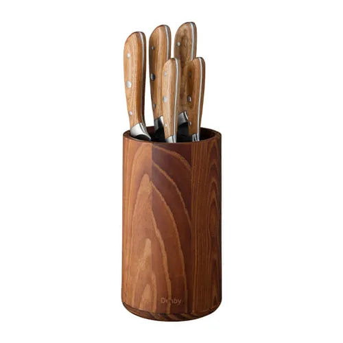 Elevate your kitchen with the Denby Carbonised Ash Wood Glass 6 Piece Knife Block Set. This comprehensive collection features a 20cm chef's knife, 20cm carving knife, 20cm bread knife, 12.5cm utility knife, 10cm paring knife, and elegant ash wood block. Crafted from premium stainless steel, each blade delivers exceptional performance for slicing, dicing, carving and chopping. The thoughtfully curated selection handles everything from vegetable prep to meat carving with precision and ease. Paired with a striking carbonised ash wood block, this set combines professional-grade functionality with contemporary design, making it an essential addition to any kitchen that values both style and performance.