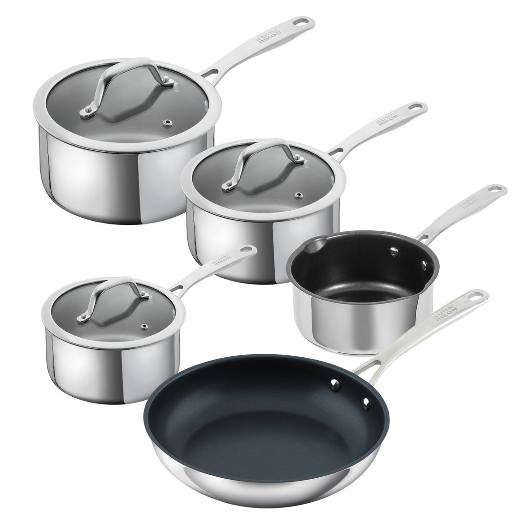 An everyday, professional 18/10 stainless steel saucepan, frying pan & milk pan set that can be used on any hob or in the oven. Use the saucepans for making sauces and soups as well as for cooking vegetables, rice, pulses and potatoes.