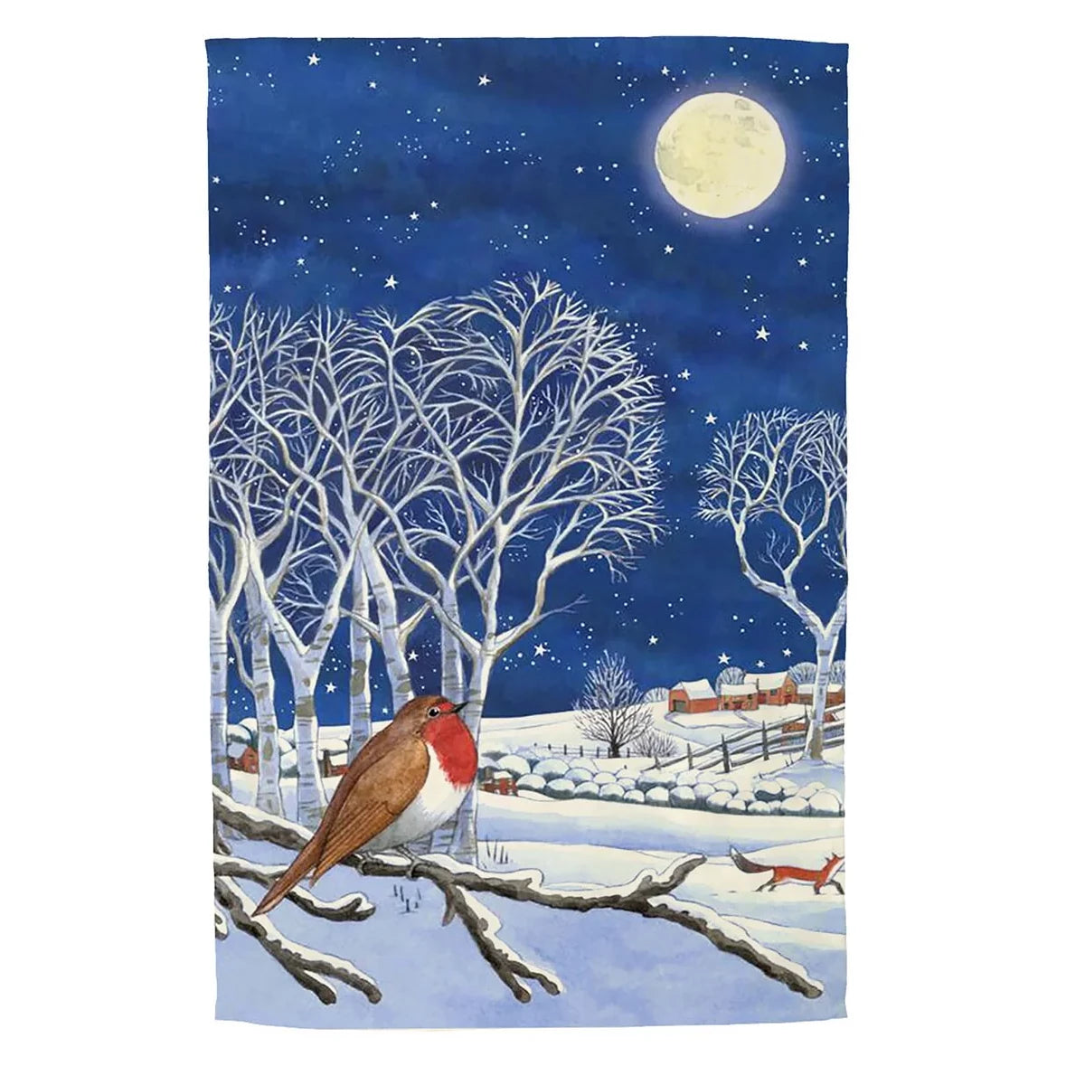 The first frosts in October trigger the thrill of colder months reminding us that winter is coming. The stillness of the landscape on our Midnight Robin Tea Towel recalls the childhood thrill of waking on a winter morning to that strange quiet brightness which can only mean one thing – that it snowed in the night! Look how the red of this robin stands out against the moonlit scene on this cotton tea towel, with his beady eye almost saying, “Forget about using this tea towel to do the drying up; that can wait until tomorrow – make a snowman or have a snowball fight instead.”