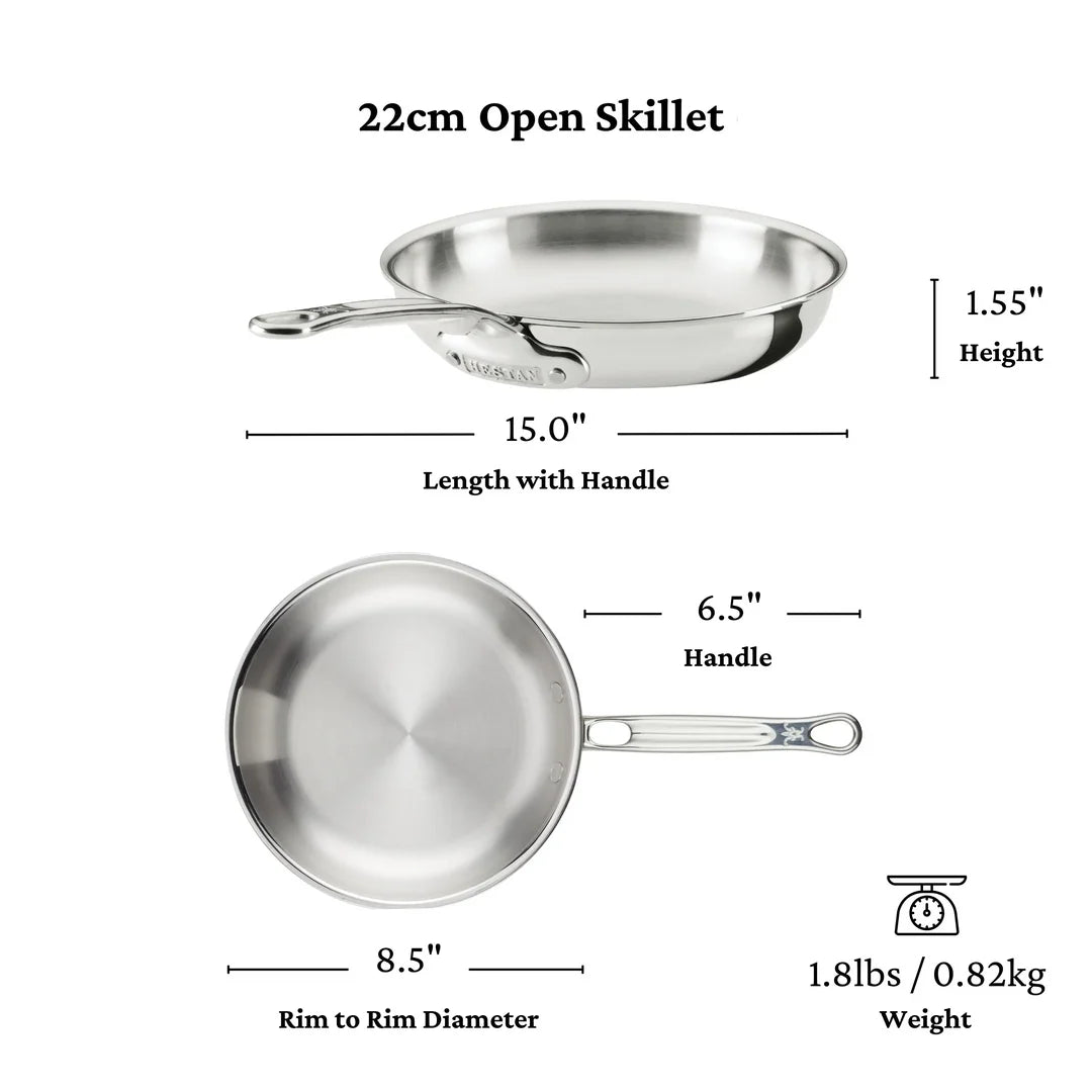 - 22cm/8.5” Skillet: 22cm/8.5”. diam., 3.8cm/1.5” high; 0.74kg/1.63 lb.